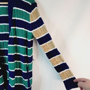Stay stylish with this vibrant striped quality cotton cardigan sweater from Land's End. Featuring a mix of green, blue, red, and tan colors, with different colour sleeves. 100% Cotton. EUC