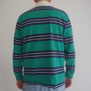 Lands' End Green Blue Stripe Rugby 100% Cotton Long Sleeve Preppy Polo Shirt L