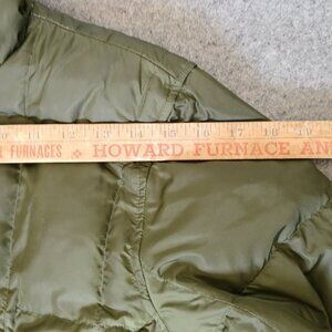 This is a pre-owned/pre-loved Lands' End goose down-filled puffer jacket in Army Green/ Bottle Green.