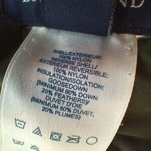 Sized womens small/ (or, size 6-8 according to the label). There are signs of wear in the zipped pockets, but other than that, great condition. Very warm, insulated with goose down filling. Nylon exterior. Quality piece of winter / fall clothing.
