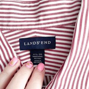 Lands' End Mens Casual Button Down Shirt Long Sleeve Traditional Fit Pinstripes Burgundy White Size 17.5