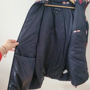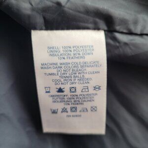 Like new condition with no holes or stains. Real 90% down filling (10% feathers). Hidden zipper outer pockets, removeable hood that has drawstring around it for cinching, inner pockets.