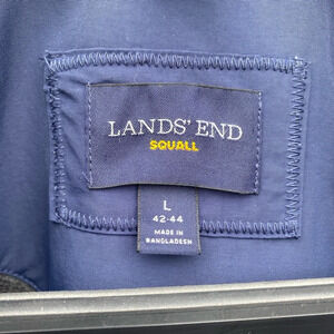 DESCRIPTION: This Nylon Shell with Fleece Lining Peacoat stays true to it nautical heritage. Lands’ End Squall Jackets are known & loved for their windproof, waterproof shell fabric. Authentic details include the classic double-breasted front, Embossed Anchor Buttons, collar and roomy handwarmer zip up pockets. Adjustable Snaps at cuffs. 2 Inner pockets. Back slit. Navy blue. Relaxed fit, not overly bulky or heavy.