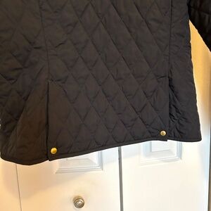 Iconic Equestrian Lands’ End Quilted Jacket. Black with Grey on inside. Full Zip front. Brass snaps on slash front pockets and back flaps. Lightweight. Easy care. Sleeves can be folded into a cuff to show reverse side.
