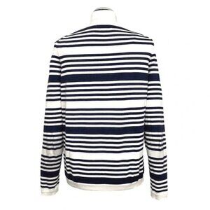 style tags: Lands' End, pullover, v-neck, warm, cozy, striped, navy & white, cozy, comfortable, cool weather. Women's size L