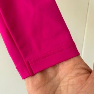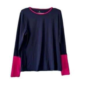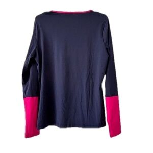 This is a long sleeve rash guard long sleeve swim t in a purplish blue and fuscia colour.