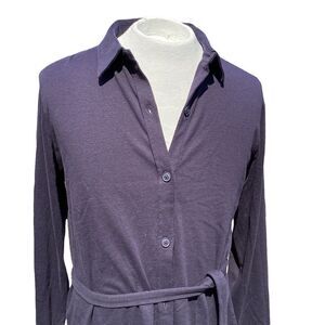 Cotton, belted and buckle, collar, long sleeve, button front, EUC. Neck to hem 26”, armpit to armpit 21”, armpit to cuff 18”.