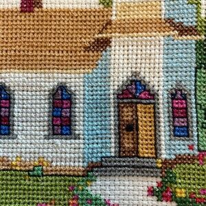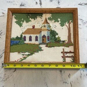 Charming landscape embroidery art, featuring a serene church yard. Wood frame with no glass. Approximately 9”x11”.