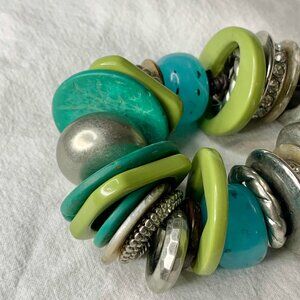 Colors: Predominantly shades of blue and green, accented with silver-toned beads and metal.