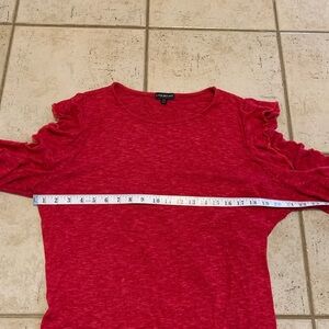 Add a pop of color to your wardrobe with this stylish Lane Bryant top. This vibrant red long-sleeve shirt features a unique ruffle detail on the shoulders and down the sleeves, adding a touch of feminine flair. The fabric has a subtle heathered texture, giving it a soft, cozy feel perfect for transitioning between seasons. Pair it with your favorite jeans for a casual look or dress it up with a skirt.