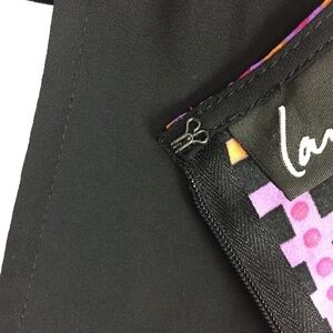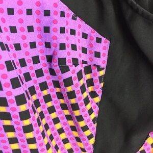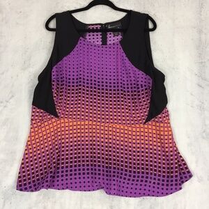 Women's Plus Size 22. 100% Polyester. Lightweight and flowy. Anti-wrinkle. Black shoulder with purple and orange geometric pattern. Zipper back. Seamed waist. Curved hem. Chest and waist darts for shaping. Great summer office piece.