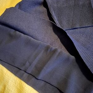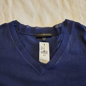 Lane Bryant women's size 18/20 fine knit navy V neck long sleeve sweater, ribbed cuffs, neck line & waist faux blouse trim on bottom and collar NWT