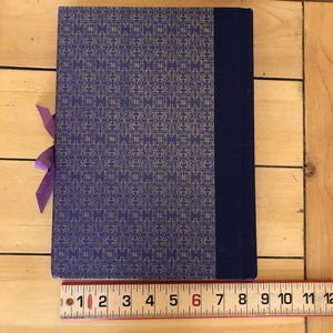 The Language of Flowers Photograph album by Harmony Books (1992) has lovely Victorian-style artwork by Bernard Higton decorating each page. Heavy card pages are die-cut with spaces to slide in your favourite photos. Book is 8 1/2" x 11 1/2" x 1 1/2" with ribbon tie closure, hardcover. IMPORTANT NOTE: First page binding has been repaired with fabric ribbon as shown in photo, hardcover has dents/dings to edges inner pages appear unused.