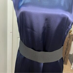 Lanvin designer silk dress in navy blue and black. Side zipper details. Deep open back.