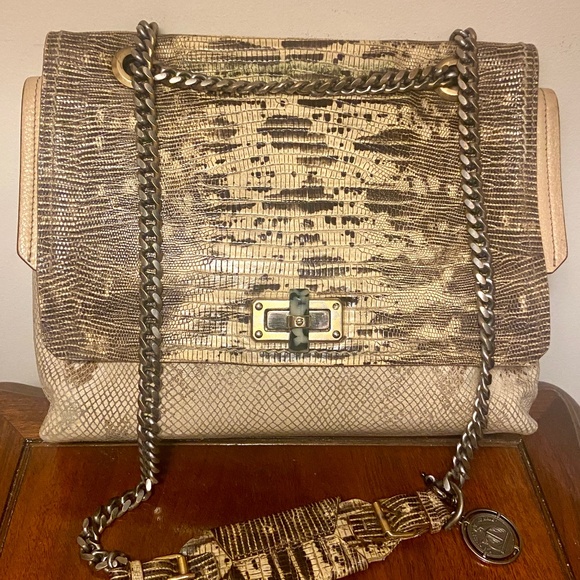Lanvin Happy shoulder flap bag is crafted from snakeskin leather with embossed lizard print on the flap in neutral tones features double convertible silver-tone chain-link strap, double flap, a turtoise resin turn-lock closure, fully lined interior, two compartments, one zipped interior pocket and gold-tone hardware. Made in France.