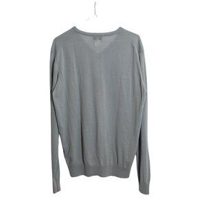 This lightweight Lanvin men’s long sleeve V-neck sweater is crafted from 100% merino wool, offering a soft and breathable feel that’s perfect for any season. With its neutral light gray color and minimalist design, this versatile piece works effortlessly for both casual and semi-formal looks. Though the size tag is missing, it’s estimated to fit like a medium, with a relaxed fit across the shoulders and chest. In excellent condition (9/10), this sweater is a timeless staple that will elevate any wardrobe.