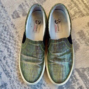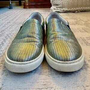 Authentic Lanvin green-gold metallic slip on runners, size 37, fits smaller like a 6. Made in Italy. Good used condition with normal wear all over, please note the spot where the lining is apart from the heel cushioning on the right shoe. Cat friendly, nonsmoking home.