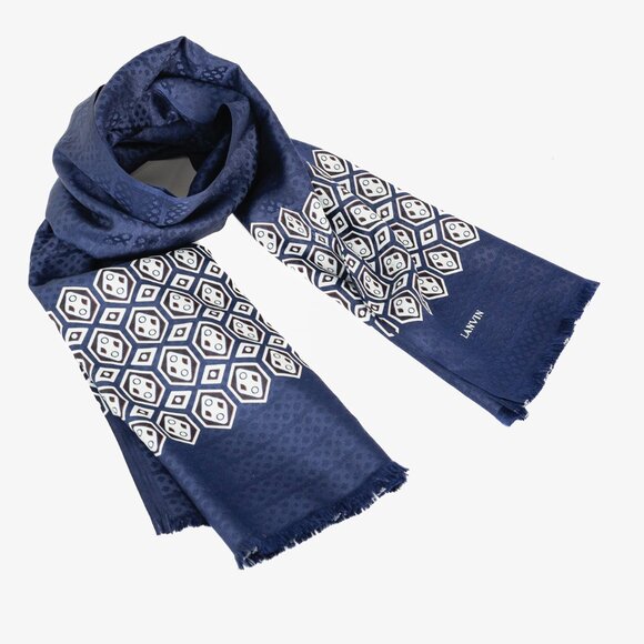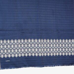 As a high-quality accessory from Lanvin, this navy geometric print scarf exudes elegance with its subtle sheen. The geometric pattern, fringed ends, and oversized design make it versatile and stylish. Made from the finest materials, it is the perfect addition to any outfit.