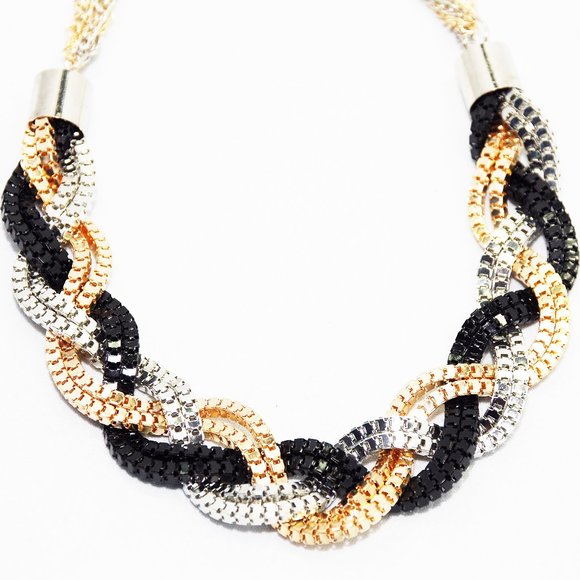 Beautiful 17” necklace made of braided metallic chains in 3 colors: black, silver, gold. Clasp closure.