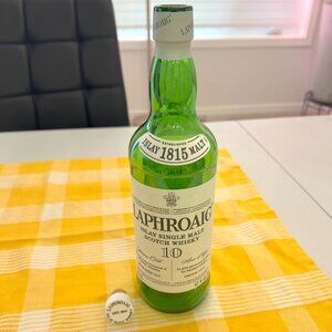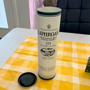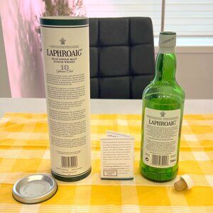 Explore the distinctive charm of the Laphroaig Peated Single Malt Scotch Empty 750ml Bottle and Tube Case, a must-have for collectors and enthusiasts alike. Once home to Laphroaig's award-winning peat scotch, this bottle, brochure and tube case offer a unique addition to any collection, displaying the iconic branding and craftsmanship that Laphroaig is known for. Crafted for those who appreciate the finer details, this bottle serves as a testament to the quality and heritage of the Laphroaig distillery. Perfect for exhibiting in your home bar, Man Cave or as a standout piece in your collection, the bottle and tube case preserve the essence of Laphroaig's rich history and tradition in Scotch.