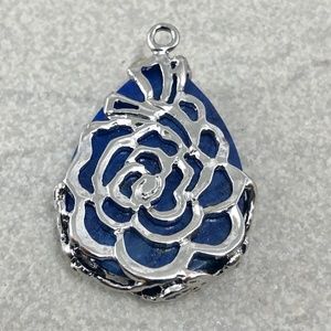 Lovely Blue Stone Pendant with Silver Tone Floral framing stone. Silver Floral design continued on reverse side. Can be worn either way. Semi-Precious Lapis Lazuli. Measures 1.5" in length by 1" in width. Tear Drop shape to stone. Nice weight to this piece.