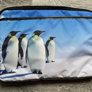 A very cute Penguin Laptop Case. The middle has a soft lining to protect your laptop. It has carrying handles as well as a padded shoulder strap. Never used.