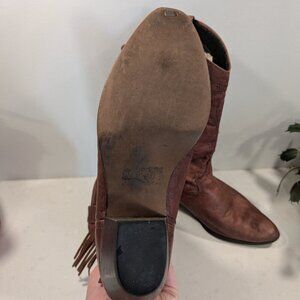 Beautiful cognac brown leather pull on cowboy boots with fringe detail.