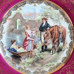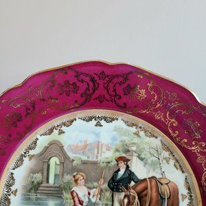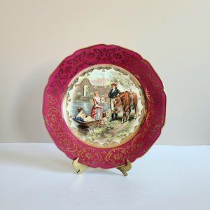 Vintage Bohemia Royal Ivory ceramic porcelain plate with 19th century scene with people and horse. Made in Czechoslovakia. Burgundy red color with gold trim and details. 10.5'' wide. Has some gold loss on the trim. Please see picture. Also have some hard glue(?) on the back. Overall is good condition, no cracks or chips.