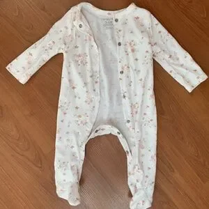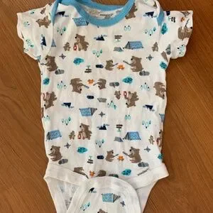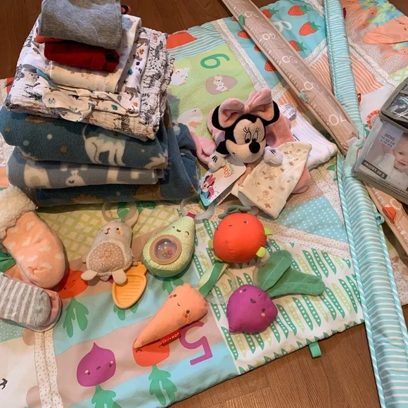 Organic cloth diapers, new, 5-pack. 3 new homemade sleep sacks. New socks. New 5-pack Gerber onesies. Newborn pants and onesies. New floral 3-6 month onesie and new matching hat (one hole on seam, easy fix) New baby plushie. Zebra receiving blanket. Skiphop farmstand play gym, missing mirror and pillow, easy to replace if wanted.