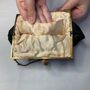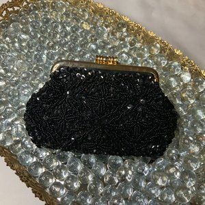 A beautiful vintage coin purse with a black sequin and gold tone frame and kiss lock closure. Excellent condition with all beads intact. Handmade in Hong Kong.