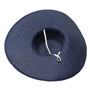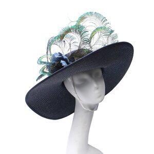 Stunning large brim hand designed hat features curled peacock plumes, peacock eye feathers and a large navy flower. This large hat is perfect for summer events, parties, or horse races. The underside features an elastic if you need it - you can cut it off as well.