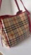 Elegant Burberry tote with iconic check pattern. Red leather trim adds a bold touch. Ideal for everyday style.
