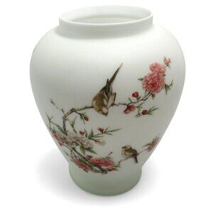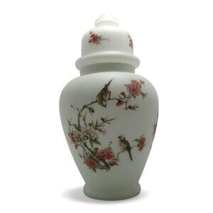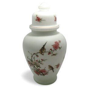 This timeless glass ginger jar is adorned with hand-painted birds perched amidst blossoming flowers, highlighting both artistry and elegance.