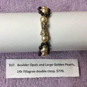Bracelet of Large Golden Fresh Water Pearls and Boulder Opals, 14k Gold double clasp. One of a kind.