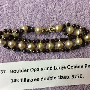 Large Golden Fresh Water Pearls and Boulder Opals, 14k Gold double clasp.