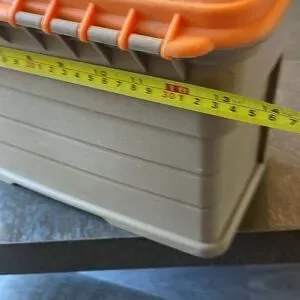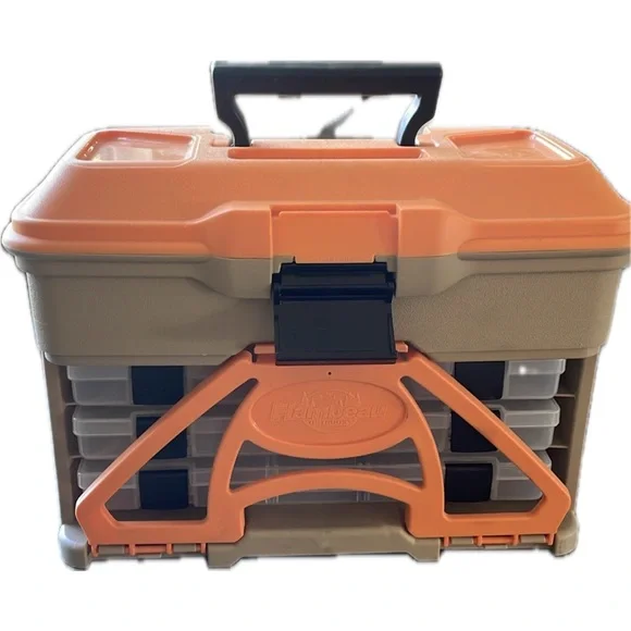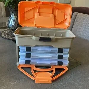 Multi Purpose Storage Container it could be used for any purposes as in storing crafts jewellery knickknacks from your garage. Three separate enclosed trays with compartments. One big open space under the lid. .