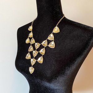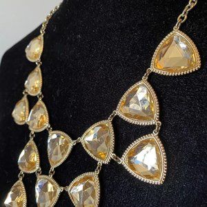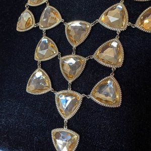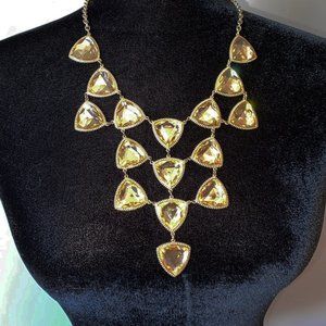 Large deep plunging necklace in gold color with light yellow triangular stones.