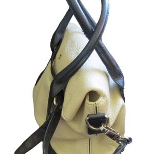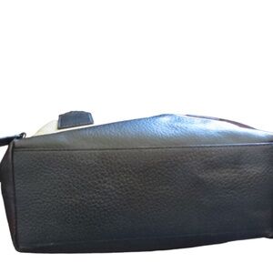 Large Pebbled Leather Kate Spade Fold Over Bag . It is in very nice clean condition. The Kate Spade gold print is very faint on the tag on the inside of the bag and it has worn off on the outside of the bag by the gold spade. Approx. 13 inches tall standing up, 13 inches across the bottom and approx. 6 inches wide. Shoulder strap is removable. It is a cream and black color. This is not a new bag but in great condition for pre owned.