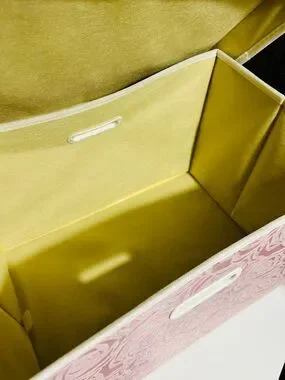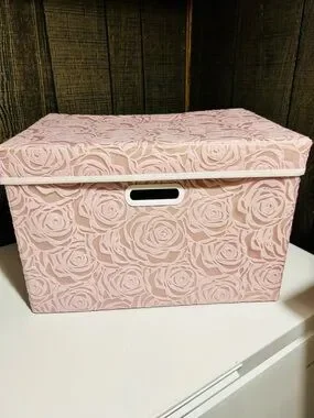 Decorative fabric storage box with lid. Light pink rose pattern all over. Sturdy cutout handle for easy carrying. Stylish and functional organizer for any room.