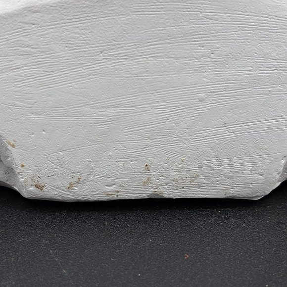 A statue of Saint Joseph as an artisan or carpenter holding a long saw against his body. The artist who made the piece was Marcel Plamondon and the statue is of painted plaster.