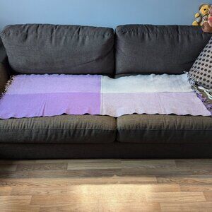 This vintage scarf has a colourblocked look with shades of purple. In excellent vintage condition, there are no noted rips, holes, stains or areas of excess wear. Fringe on two ends.