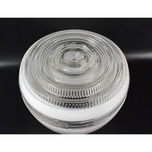 From the 1940s or 1950s, this is a lovely mid-century round glass ceiling lamp shade in beautiful condition. It has painted white sides with clear faceted glass ridges facing downward. It would look perfect in a hall or entryway of a period home. Its clean lines would also suit a modern home.