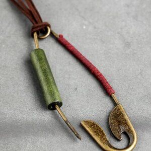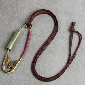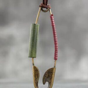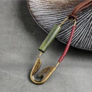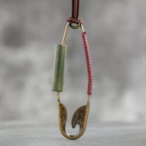 Make a bold and unique statement with this oversized safety pin necklace! This eye-catching unisex piece features a huge, functional safety pin pendant in a brass tone. The pin is adorned with striking dark green wood, rich burgundy/wine faux leather, and a rustic brown faux leather rope chain. This bohemian-inspired necklace is perfect for adding an unconventional and artistic touch to any outfit. The pendant even opens, adding an unexpected element of intrigue!