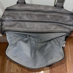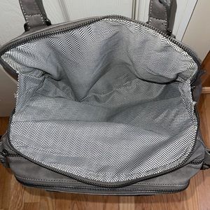 TONS OF ROOM! Main part has a zipper pocket and two other open pockets. 2 more large zippered areas— one in the front, the other in the back. No flaws! Comes with adjustable shoulder strap! Would be great for traveling or as a diaper bag also!