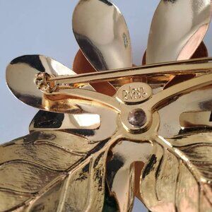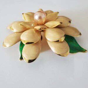 This is a large statement Joan Rivers brooch pin. The Joan Rivers mark is on the back of the brooch. The 3-dimensional flower is cream swirl enamel with a gold-trimmed tip petal and a pink lustre faux pearl center. Green leaves are peaking through the petals. This beautiful, large brooch is perfect as a coat brooch.
