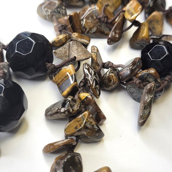 Beautiful Long fashion necklace of earthy brown beads Interlaced with some Large Round Faceted black beads