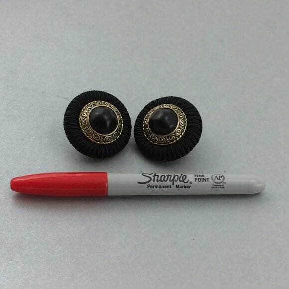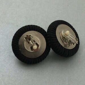 Large Vintage 80s Domed Clip-On Earrings Black Silver Metal Fabric 1980s Round