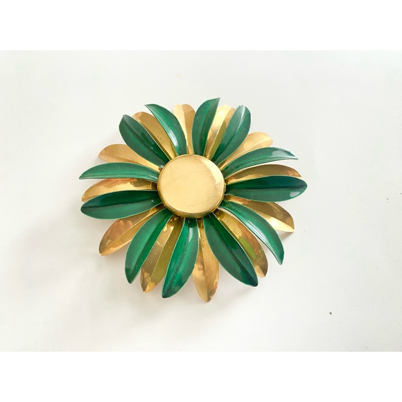 Large Vintage Green and Gold Enamel Flower Brooch Daisy Pin.