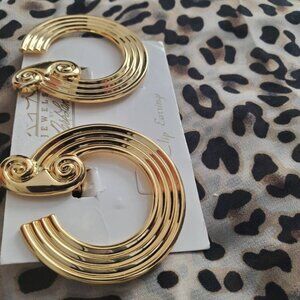 These large statement art deco Park Lane clip-on earrings are new on the original card. They are 3/4 hoops with a decorative end. The earrings are unsigned.