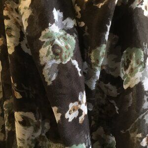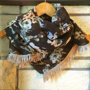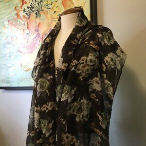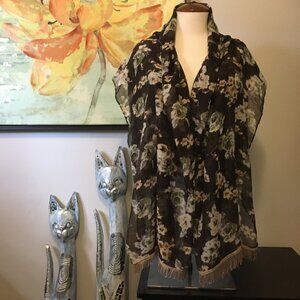 Very good preowned condition, long, voluminous, semi sheer, gauzy scarf with tassels featuring a floral pattern (roses) in browns, beige, sage-green, grey, yellow and white. Some of the tassels appear shorter than others, at least to me. Would also serve as a nice shabby chic tablecloth.
